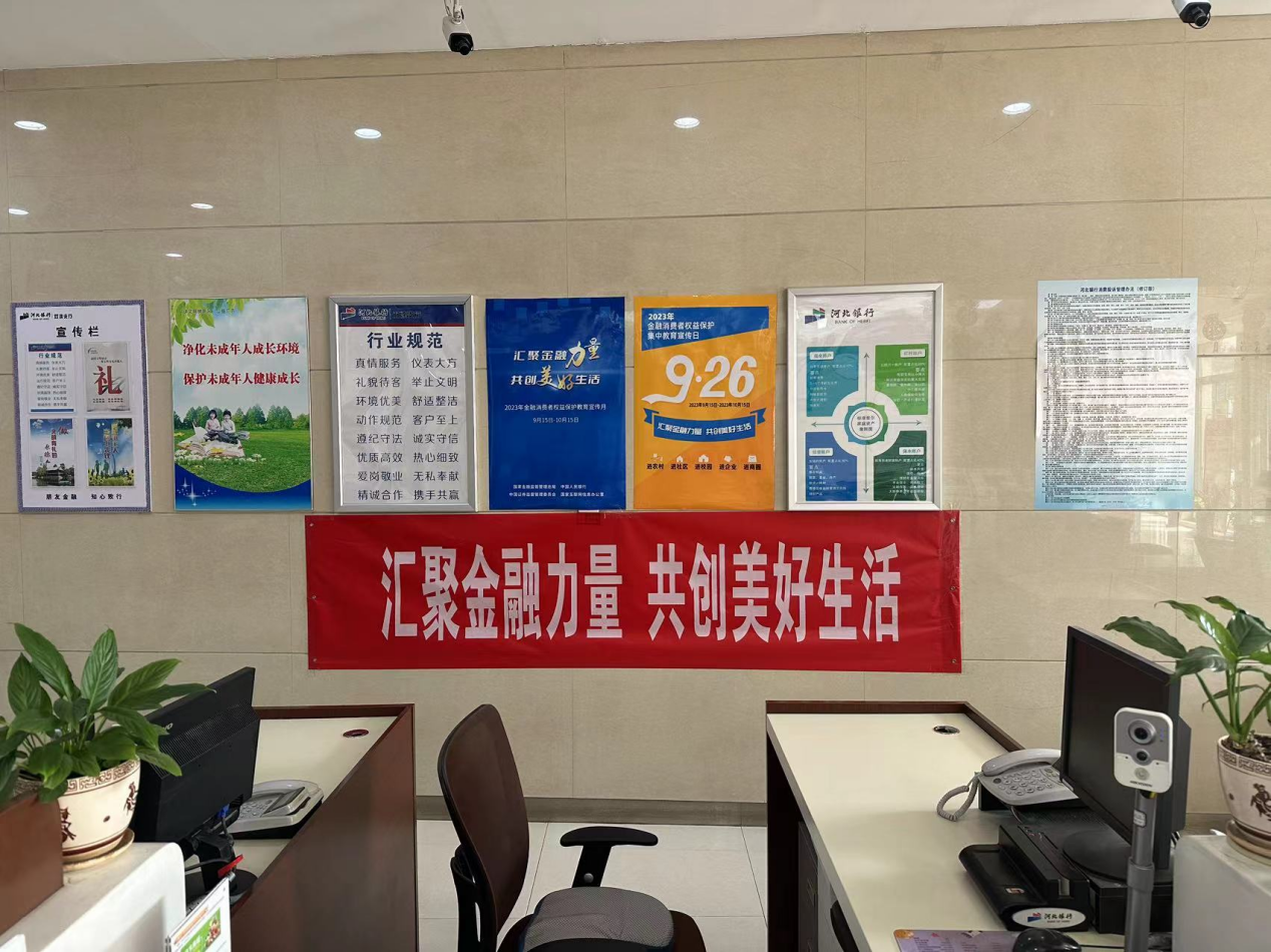 为深入学习贯彻习近平新时代中国特色社会主义思想,全面落实党的二十大精神,切实提升社会公众金融素养,防范化解金融风险,按照国家金融监督管理总局、中国人民银行、中国证券监督管理委员会、国家互联网信息办公室的指导与部署,河北银行9月15日正式启动2023年“金融消费者权益保护教育宣传月”活动,线上线下相结合,全行上下齐发力,全方位、多渠道开展。
