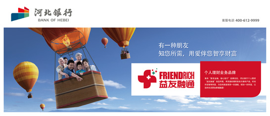秉承“朋友金融、知心致行”品牌定位,河北银行个人理财“益友融通”知客户所需,用完善的理财服务方案和产品,伴随客户智享财富,为客户的家庭增添温暖,增加财富,让客户生活更加幸福融通! “益友融通”个人理财的主标识元素“+”,是一个加号的变形,代表“益友融通”助客户财运融通、财富增加;标识经设计手法上的艺术处理,如同一个不停旋转的风车,象征客户的财富与河北银行的事业顺风顺水、生生不息。标识整体采用红色作为主色调,象征着“益友融通”以赤诚的心服务于客户,与广大客户一起红红火火,迈向崭新的财富未来。