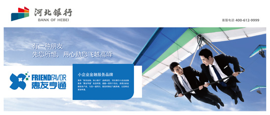 秉承“朋友金融、知心致行”品牌定位,河北银行小企业金融服务“惠友亨通”知客户所想,借助一系列个性化、多层次的金融服务产品,与客户同行,助客户事业飞越高峰,伴客户商运亨通。 “惠友亨通”小企业金融服务的主标识元素“X”是一个乘号,寓意选择“惠友亨通”品牌服务,如同选择一个相知多年的老朋友,助客户财富倍增;“X”经过设计手法上的艺术处理,如同一个不停旋转的风车,象征客户的事业与河北银行的事业顺风顺水、生生不息。标识整体采用蓝色作为主色调,象征“蓝图在胸”,客户事业与人生如一片蓝海宛若眼前。