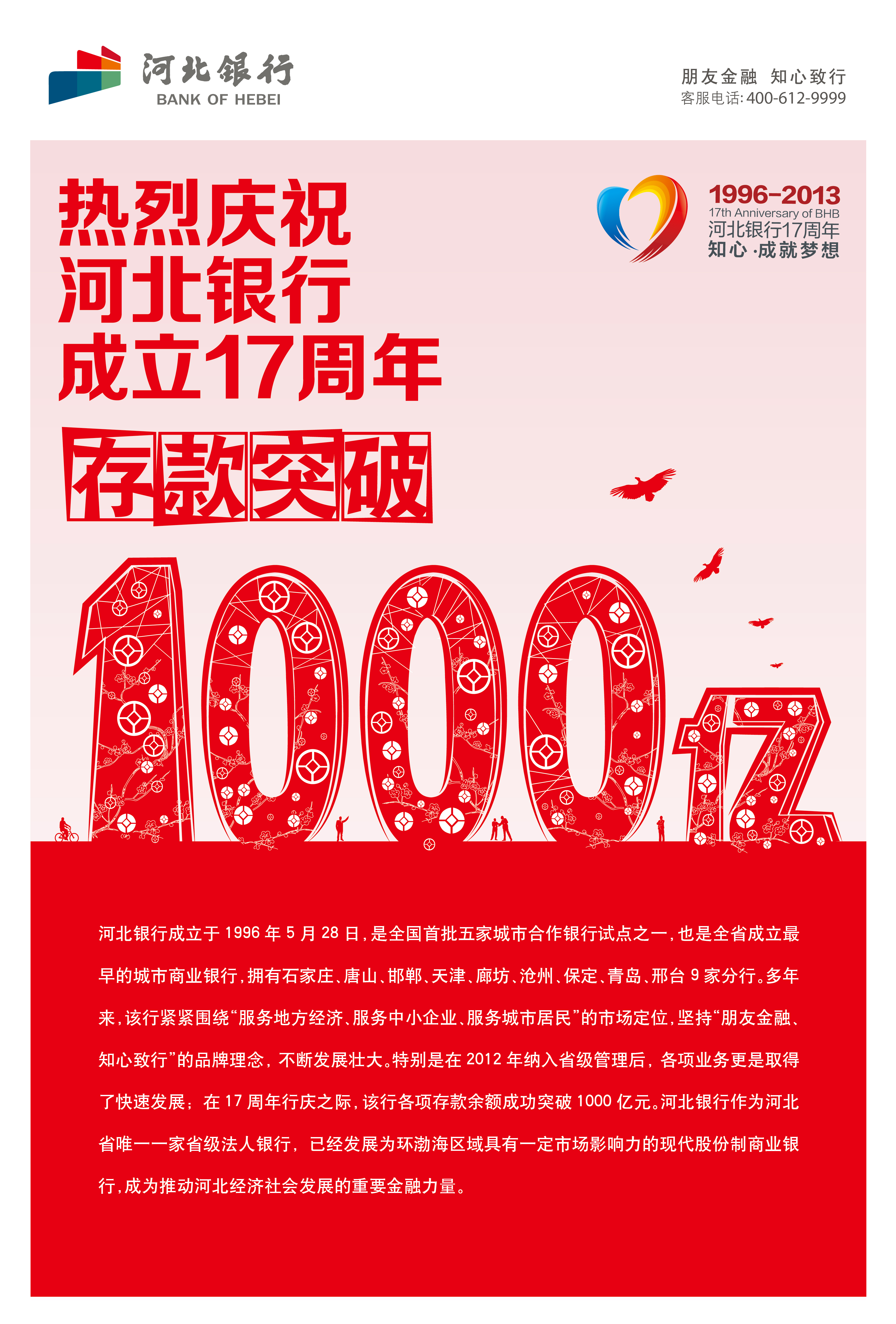 热烈庆祝河北银行成立17周年,存款突破1000亿