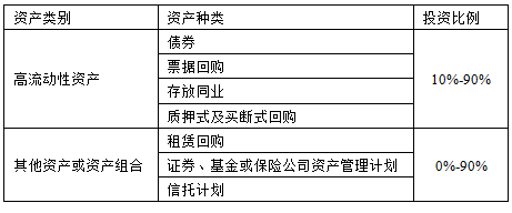 本理财计划资金由河北银行投资于以下符合监管要求的各项资产:一是高流动性金融工具,包括但不限于存放同业、银行间市场质押式回购、票据回购、较高信用等级债券;二是其他资产或资产组合,包括但不限于租赁回购、证券、基金或保险公司资产管理计划、信托计划等。本产品投资的资产种类和比例如下,可在[-10%,+10%]的区间内浮动: