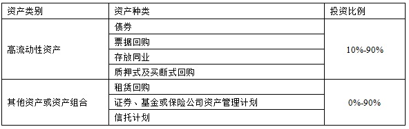 本理财计划资金由河北银行投资于以下符合监管要求的各项资产:一是高流动性金融工具,包括但不限于存放同业、银行间市场质押式回购、票据回购、较高信用等级债券;二是其他资产或资产组合,包括但不限于租赁回购、证券、基金或保险公司资产管理计划、信托计划等。本产品投资的资产种类和比例如下,可在[-10%,+10%]的区间内浮动: