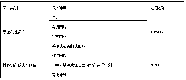 本理财计划资金由河北银行投资于以下符合监管要求的各项资产:一是高流动性金融工具,包括但不限于存放同业、银行间市场质押式回购、票据回购、较高信用等级债券;二是其他资产或资产组合,包括但不限于租赁回购、证券、基金或保险公司资产管理计划、信托计划等。本产品投资的资产种类和比例如下,可在[-10%,+10%]的区间内浮动: