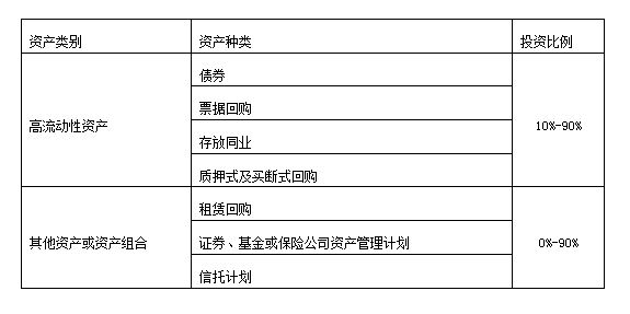 本理财计划资金由河北银行投资于以下符合监管要求的各项资产:一是高流动性金融工具,包括但不限于存放同业、银行间市场质押式回购、票据回购、较高信用等级债券;二是其他资产或资产组合,包括但不限于租赁回购、证券、基金或保险公司资产管理计划、信托计划等。本产品投资的资产种类和比例如下,可在[-10%,+10%]的区间内浮动:
