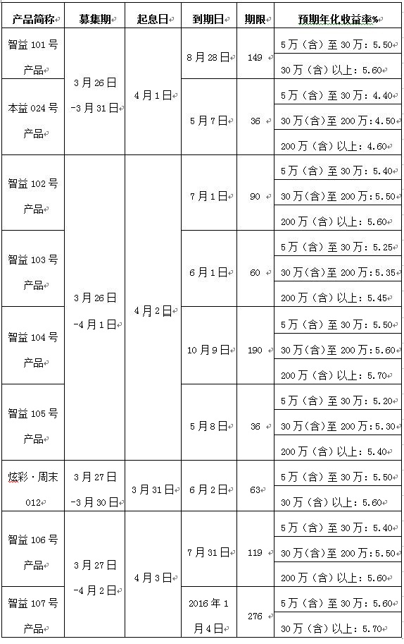 2015年3月26日至2015年4月2日我行将陆续发行八款非保本浮动收益类理财产品:智益101号(151123),智益102号(151125),智益103号(151126),智益104号(151127),智益105号(151128),智益106号(151129),智益107号(151130),炫彩·周末012号(151120)和一款保本浮动收益类理财产品:本益024号(151124)。九款理财产品发售明细如下: