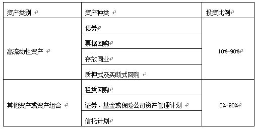 本理财计划资金由河北银行投资于以下符合监管要求的各项资产:一是高流动性金融工具,包括但不限于存放同业、银行间市场质押式回购、票据回购、较高信用等级债券;二是其他资产或资产组合,包括但不限于租赁回购、证券、基金或保险公司资产管理计划、信托计划等。本产品投资的资产种类和比例如下,可在[-10%,+10%]的区间内浮动: