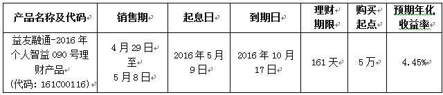 我行正式发售唐山分行专属“益友融通-2016年个人智益090号理财产品”的公告