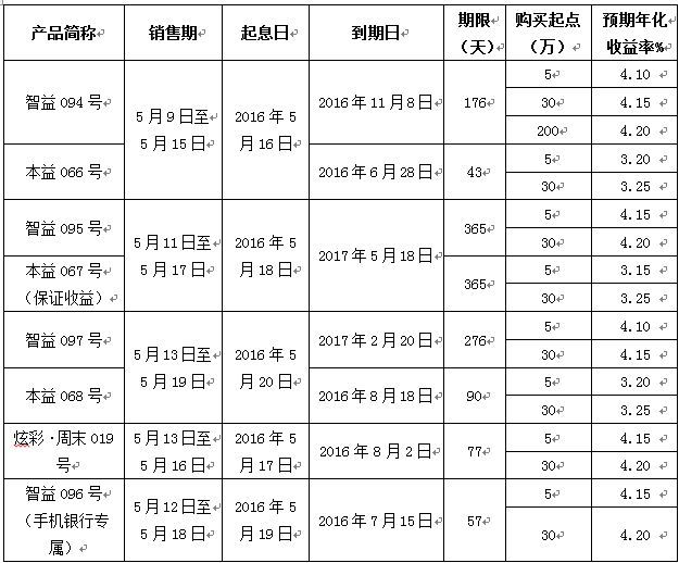 智益096号理财产品于2016年5月12日9:00发售,客户仅限通过我行手机银行购买,单个客户累计认购上限50万(含)元整;炫彩周末019号理财产品于2016年5月13日9:00发售,客户仅限通过我行手机银行、网上银行购买,单户累计认购上限200万(含)元整。其他理财产品均可通过我行各营业网点及网上银行、手机银行购买。