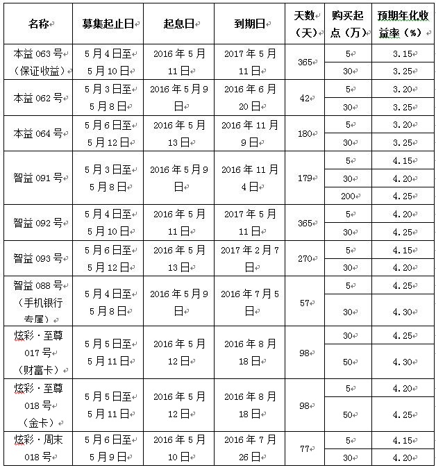 2016年5月3日至5月12日理财产品发售及开放公告