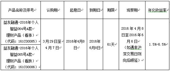 我行正式发售“益友融通-2016年个人智益064号A款、065号A款理财产品”的公告