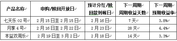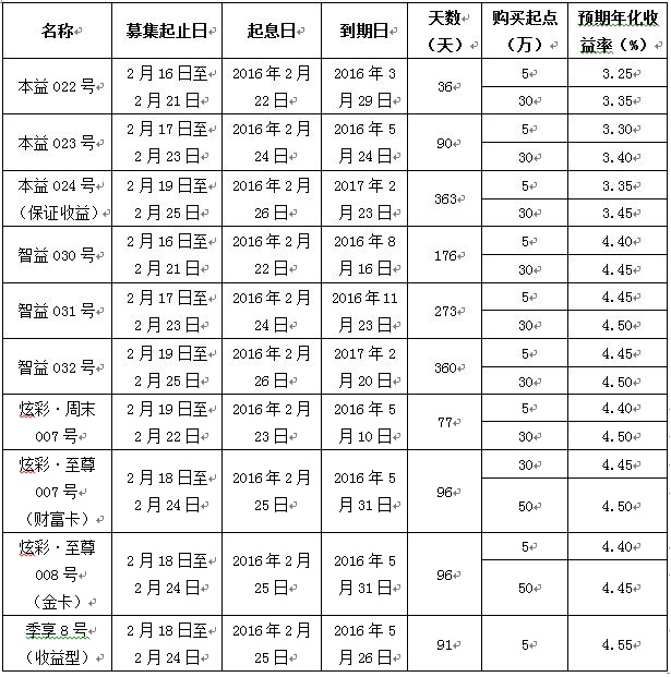 2016年2月16日至2月25日理财产品发售及开放公告