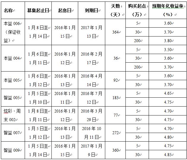 2016年1月5日至年1月14日理财产品发售公告