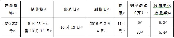 智益337号理财产品(代码151461)将于2015年9月28日08:00发售,销售区域仅限邯郸地区,客户仅可通过销售区域营业网点低柜购买。