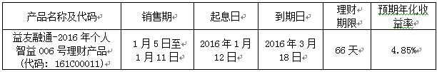 为感谢广大客户对我行理财业务的关注与支持,我行特在秦皇岛地区推出“益友融通-2016年个人智益006号理财产品”,发售产品相关信息如下: