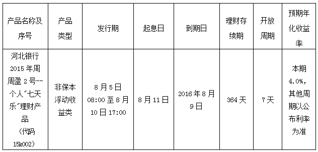 为满足个人理财客户不同期限理财需求,丰富我行理财产品,我行将继续推出周期开放型产品,产品名称为河北银行2015年周周盈2号--个人"七天乐"理财产品(代码15k002),具体发售明细如下: