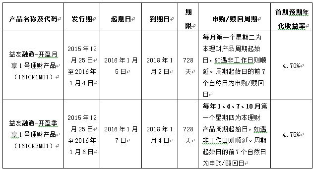 我行正式发售“益友融通-开盈月享1号、季享1号理财产品”公告